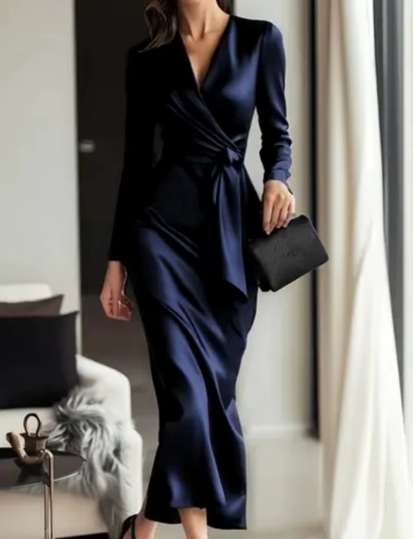 Langarm Satin Kleid Elegant für Hochzeitsgäste in Marineblau