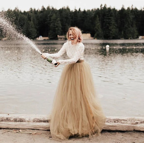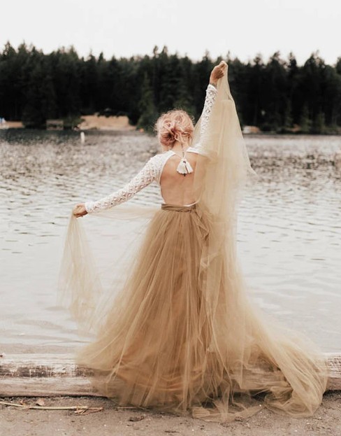 Long tulle skirt for the bride in gold
