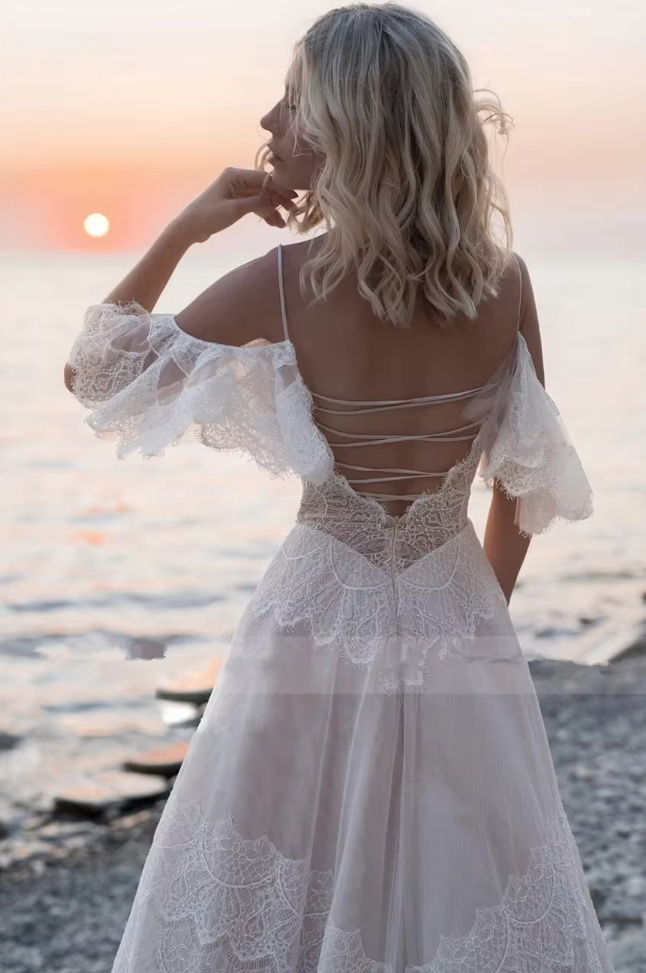 Spaghetti strap A-line boho wedding dress Bienke with lace and tulle
