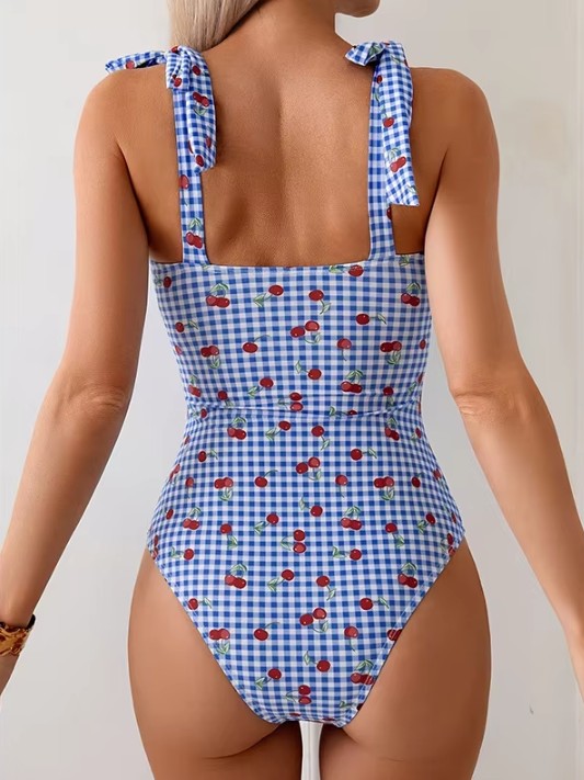 Vintage style swimsuit Shayenne in light blue check with cherry pattern
