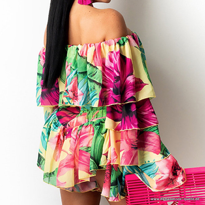 Chiffon Sommer Jumpsuit Einterler Schulterfrei mit Blumen Gelb