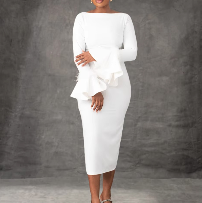 Calf-length pencil civil wedding dress Bernadette with flare sleeves in white
