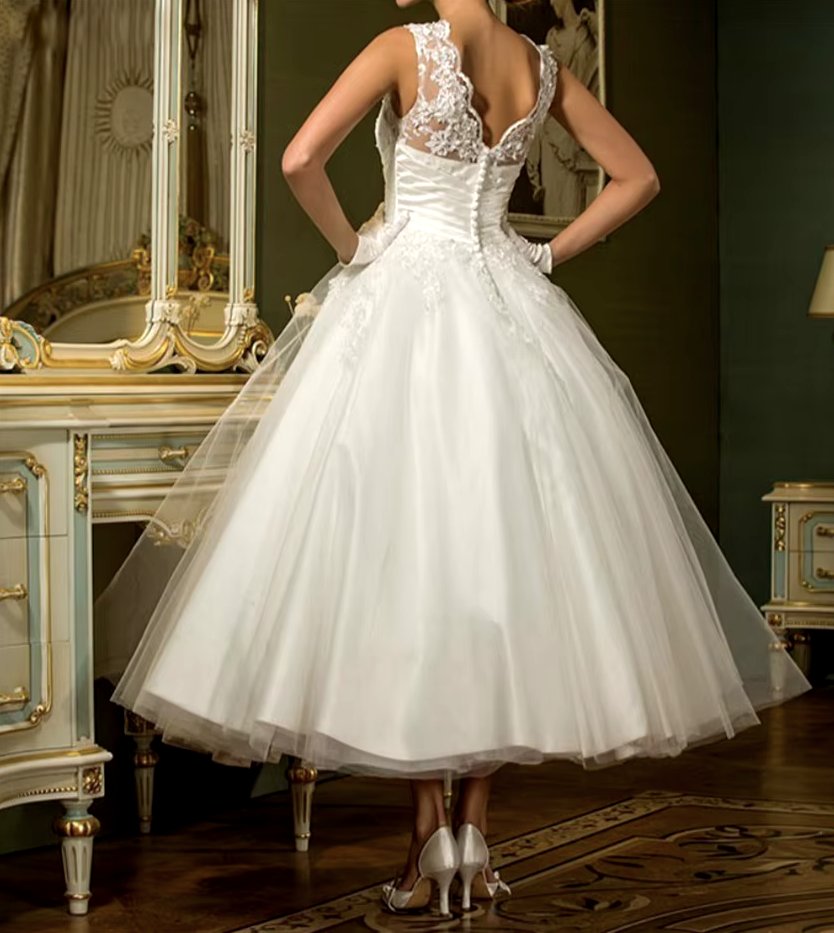 Calf-length vintage-style wedding dress, Chinara style, with lace, sleeveless