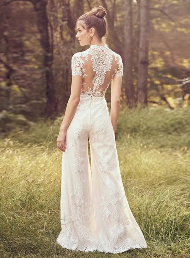 A-line short-sleeved boho bridal jumpsuit in lace, civil ceremony wear