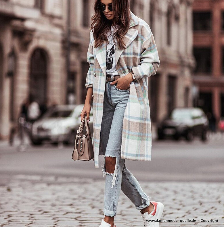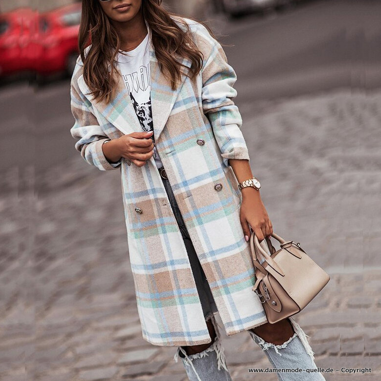 Damen Damen Wollmantel Lang mit Vintage Karomuster Grün